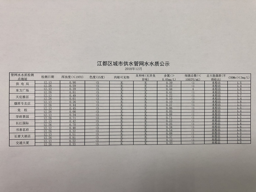2018年12月江都區(qū)城市供水管網(wǎng)水水質公示