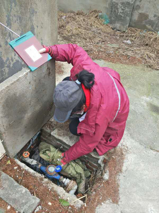 2月21日上午,多云。朱師傅頭戴鴨舌帽,佩戴口罩,膠手套,穿著雨衣,做好個人防護措施,帶著抄收賬簿、分揀好的發(fā)票、手電筒、撬棒來到二姜區(qū)域,開始“抄收復工”。“你是誰,廠子還沒復工,領導沒來呢!”二姜四方電鍍廠門衛(wèi)一開始沒認出全副武裝,只露出兩只眼的朱師傅,很警惕。“姜師傅,您好!我是抄表員小朱,來看看急降溫后廠子供水是否正常運行,順便抄表。”朱師傅配合好鞋底消毒和體溫槍測量體溫后,先在廠子里巡查一圈,未發(fā)現漏水現象,然后來到廠西南角水表處,她嫻熟地打開水表井,“表深要確保表讀數精確,避免用戶不滿意”,她一邊嘀咕著一邊左手拿出手電筒照明,右手用紙手帕擦拭去水表玻璃上的污垢,認真讀表,確認讀數“7078m³”。