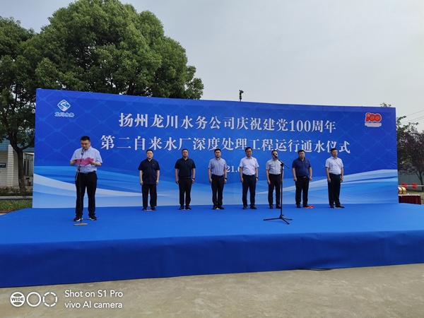 6月29日上午,在喜迎中國共產(chǎn)黨百年華誕之際,揚(yáng)州龍川水務(wù)公司在第二自來水廠隆重舉行深度處理工程運(yùn)行通水儀式。江都區(qū)副區(qū)長楊曉榮、發(fā)改委副主任王安國、住建局副局長高翔宇、水務(wù)局副局長高寅峰、衛(wèi)健委副主任劉俊杰,以及揚(yáng)州龍川控股集團(tuán)黨委書記、董事長朱成勇,黨委副書記、總經(jīng)理高鵬應(yīng)邀出席活動(dòng)。龍川控股集團(tuán)各單位代表、龍川水務(wù)全體領(lǐng)導(dǎo)班子成員、中層干部及其下屬各單位三級以上管理人員、全體黨員以及工程建設(shè)、施工、監(jiān)理單位代表170余人參加了運(yùn)行通水儀式。
