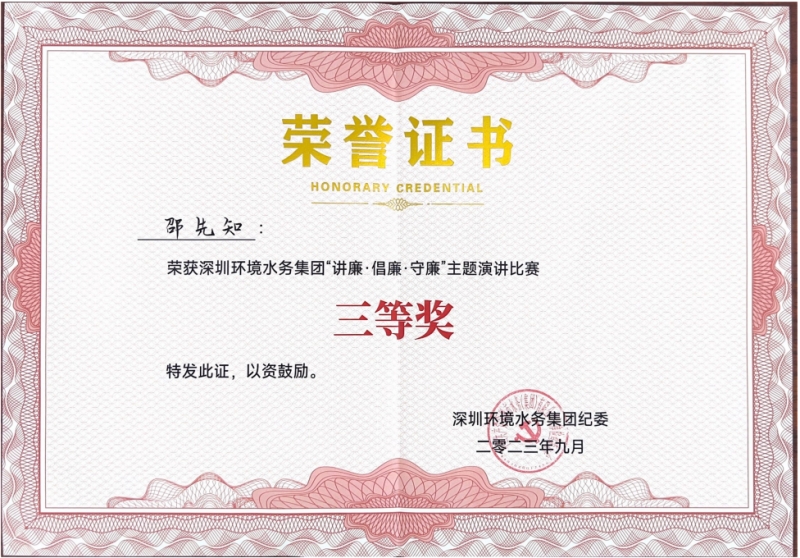 龍川水務(wù)公司參賽選手在環(huán)水集團(tuán)“講廉、倡廉、守廉”主題演講比賽中榮獲三等獎(jiǎng)
