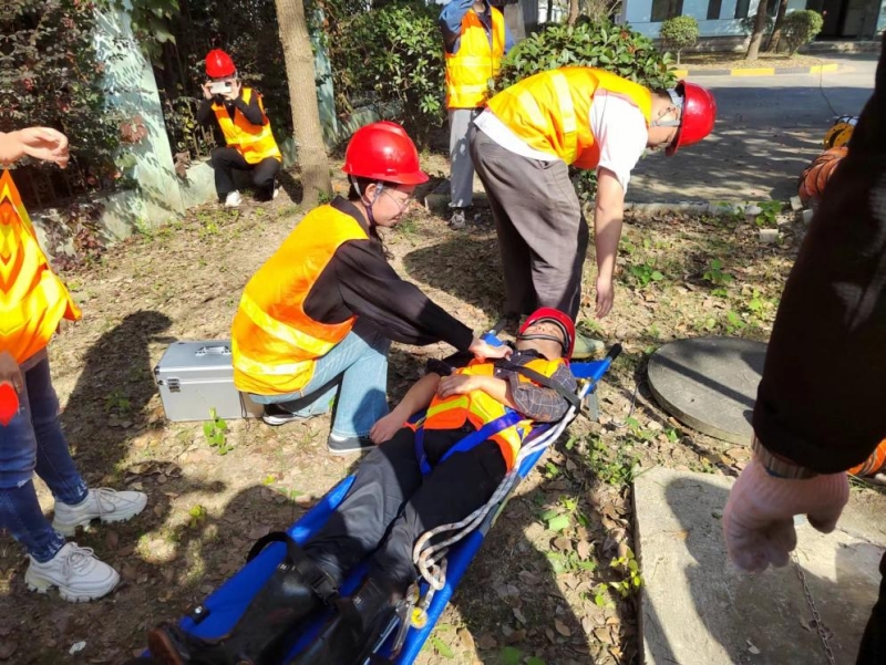 現(xiàn)場后勤保障組放置救援三腳架、使用鼓風(fēng)機(jī)進(jìn)行通風(fēng)作業(yè),同時(shí)拉警戒線,疏散人員;搶修組穿戴救援繩、佩戴呼吸器、攜帶救援繩下井救人;救援組抬擔(dān)架、挎醫(yī)藥箱在閥門井口等待......現(xiàn)場演練緊張有序,隨著傷員被救出閥門井,放上擔(dān)架、轉(zhuǎn)移至通風(fēng)空曠處,展開現(xiàn)場救護(hù)工作,直至救護(hù)人員到達(dá),此次演練活動(dòng)取得圓滿成功。