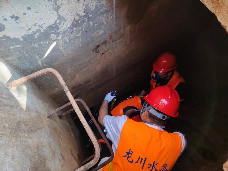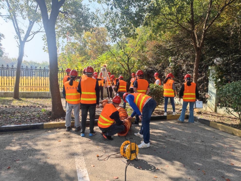 演練內(nèi)容為模擬有限空間事故發(fā)生在丁伙泵站進(jìn)水閥門井現(xiàn)場,由于人員違章操作,在未經(jīng)審批的情況下,下井作業(yè)暈倒,情況十分危急,指揮組命令立即啟動(dòng)有限空間應(yīng)急搶修預(yù)案,各小組人員立即趕往現(xiàn)場進(jìn)行救援。