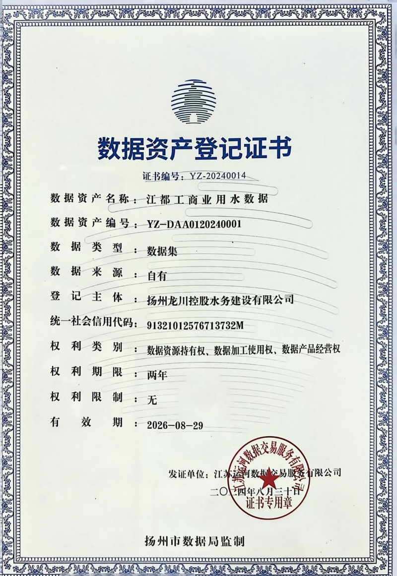 在當今數(shù)字化時代,數(shù)據(jù)已成為企業(yè)的核心資產(chǎn)和重要競爭力。揚州龍川水務積極響應時代號召,大力推進數(shù)字化轉型,不斷加強數(shù)據(jù)資產(chǎn)的管理和開發(fā)。經(jīng)過嚴格的審核和評估,龍川水務成功獲得了這一具有重要意義的數(shù)據(jù)資產(chǎn)登記證書。