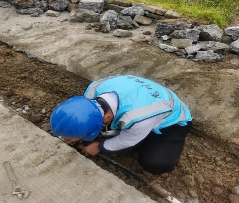 12月19日上午8點,南片維修所接到客服報修,反映宜陵鎮(zhèn)七里張營紅綠燈處挖機挖路導致管道破裂漏水嚴重,且漏水點在路邊,行人來往頻繁,存在安全隱患。我片區(qū)維修作業(yè)人員喬金于立即趕往現(xiàn)場查看,經(jīng)過實地查勘,最終探明漏水原因是PVC32管道破裂。隨后,喬金于不顧天氣寒冷,脫掉厚外套,穿上雨靴,立即開展搶修工作。零下的寒冬里,路上的行人包裹得嚴嚴實實,但搶修管道的工作人員沒有絲毫懈怠,干得熱火朝天,汗水打濕了衣服。喬金于先用鐵鍬一鍬一鍬的挖開泥土,把管道暴露出來,隨即雙腳站在泥土中,用角鋸鋸開管道,對破損的PVC32管更換伸縮節(jié)。經(jīng)過一套行云流水般的操作,此次搶修工作圓滿完成,恢復正常供水。